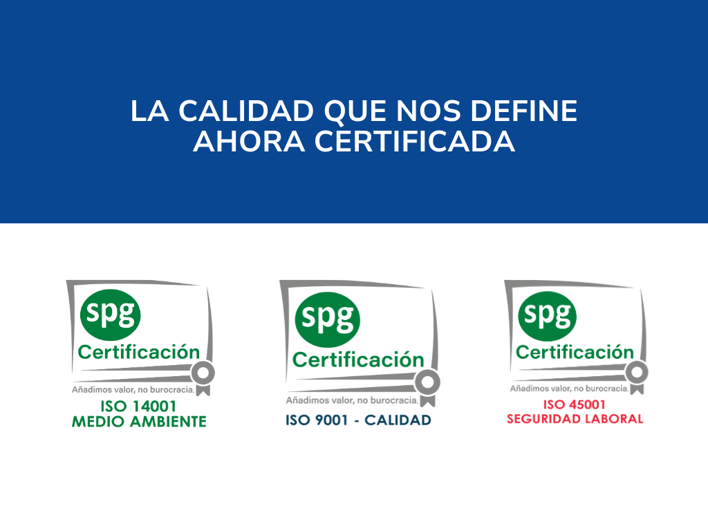 Estas certificaciones son ISO 9001, ISO 14001 e ISO 45001, tres sellos que garantizan que nuestros procesos, nuestra forma de trabajar y nuestra organización cumplen con estándares exigentes y auditados por organismos independientes.